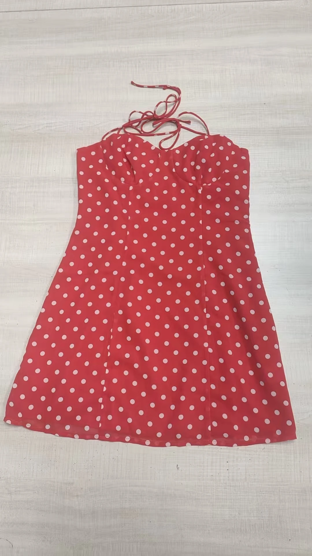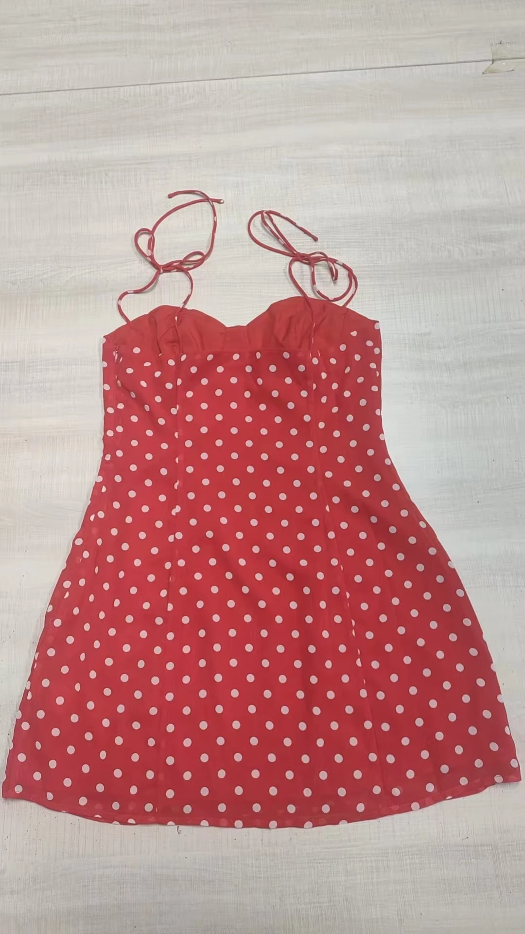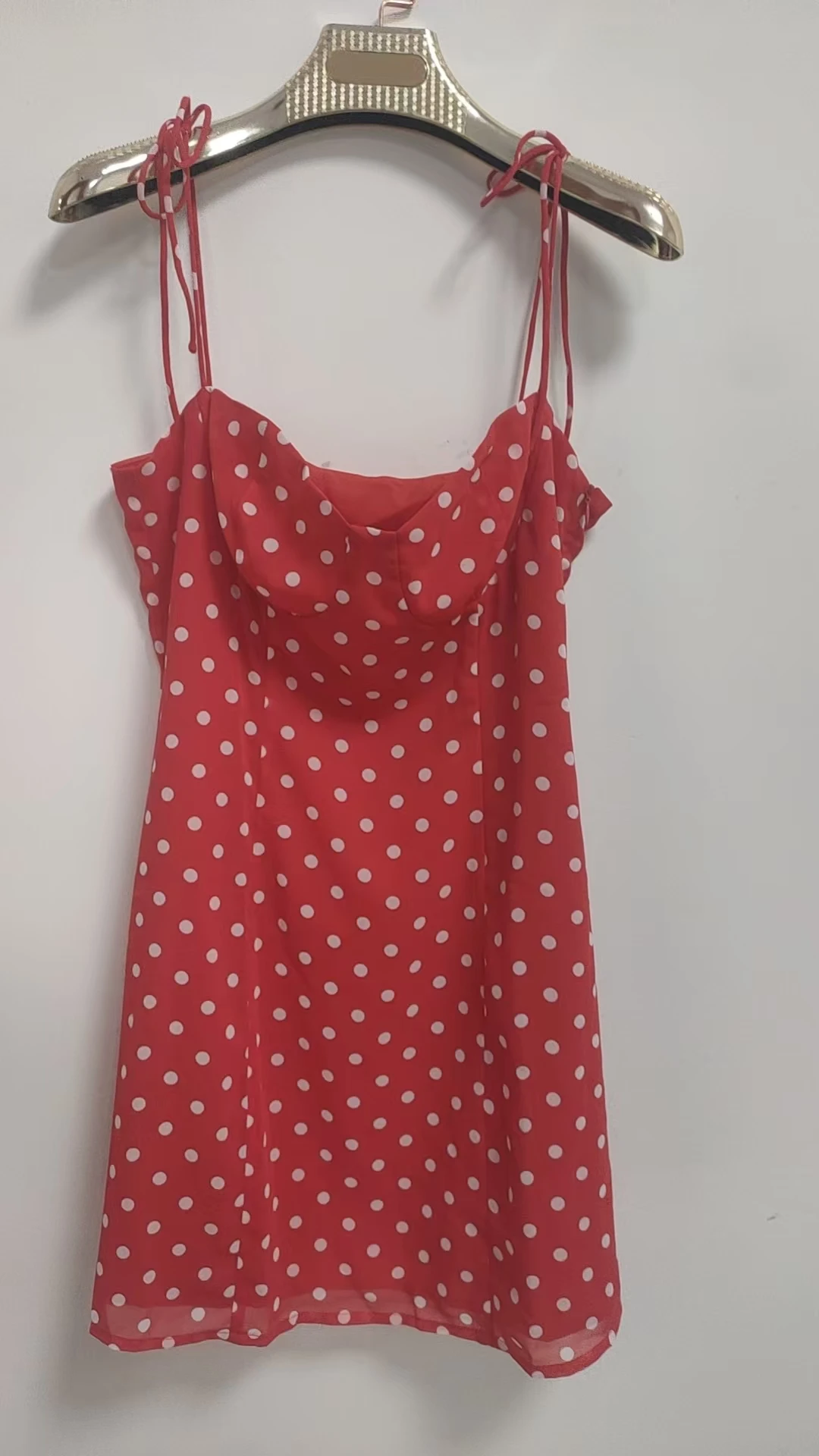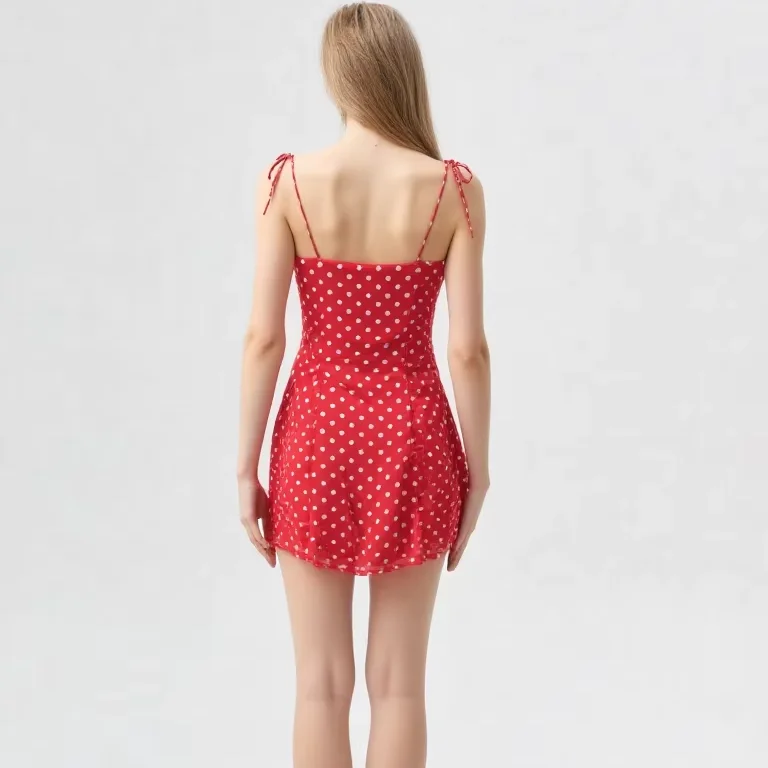Red Chiffon Mini Dress with Polka Dot Print Thin Spaghetti Straps Bow Tie Detail Natural Waistline Washable Woven Fabric